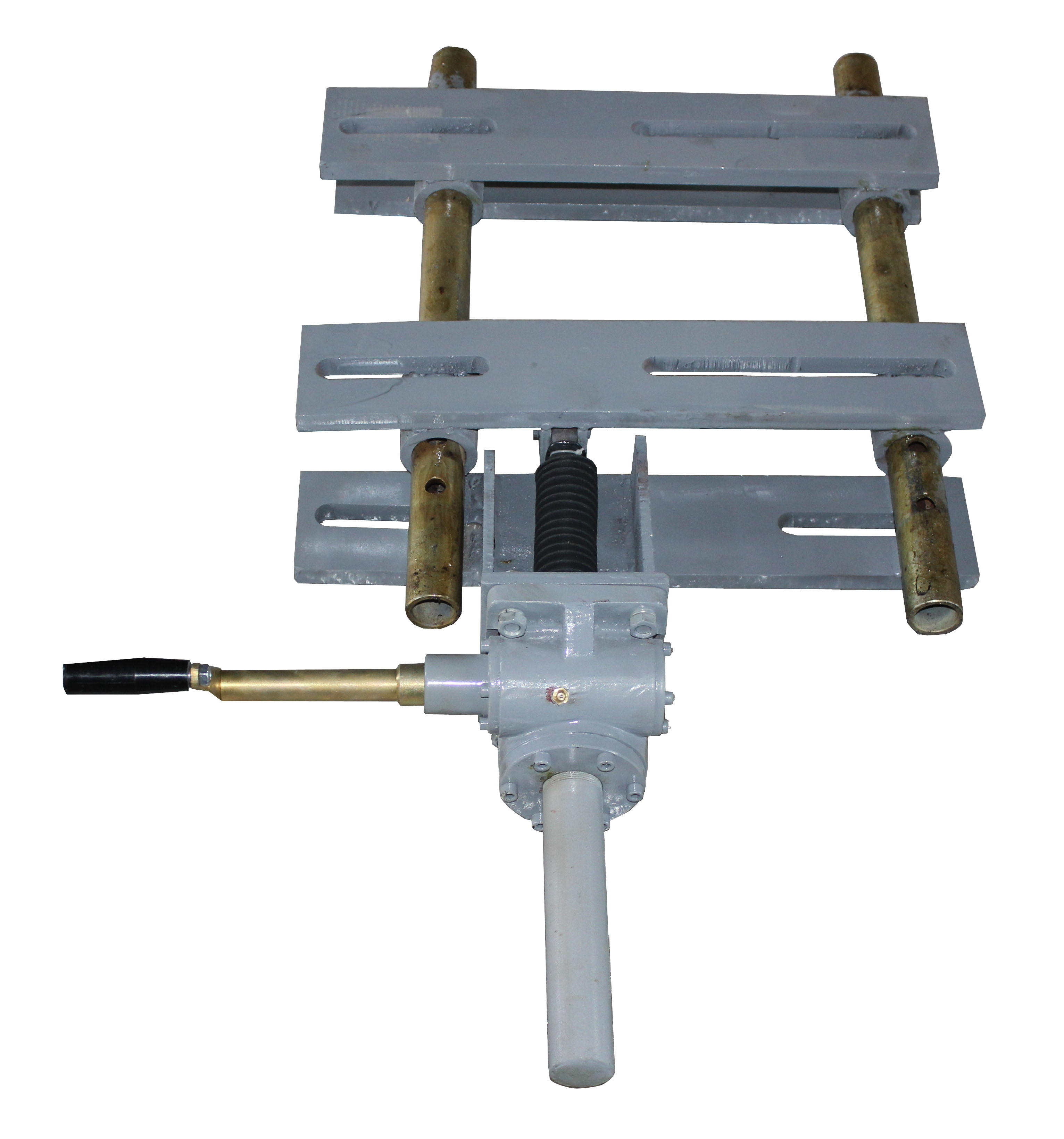 隨著石油能源需求量的急劇增加,各種抽油機械也夜以繼日地不停運轉,導致傳動皮帶時常因松動而在皮帶輪之間打滑,如不及時緊帶,傳動效率將會下降、甚或出現燒帶,給生產造成損失。普通油井換帶周期一般為兩月一次,特殊油井甚至一月一次,如需換帶則須停機,因此更換和調整必須方便快捷。其中,實用的方法就是在電動機底座上調整,原始方法是松開電機顧卻螺釘、用撬棍撬動電機,就位后再緊固螺釘。上述方法少需要兩個人以上才能完成,且若操作不當會帶來隱患;況且停井時間長,容易卡井,帶來更大經濟損失;另外由于電機底腳螺釘銹蝕、可操作空間狹小,使拆裝更為不便。因此亟需設計一種結構簡單、操作十娥、安全方便、適應范圍廣的 皮帶調整裝置。