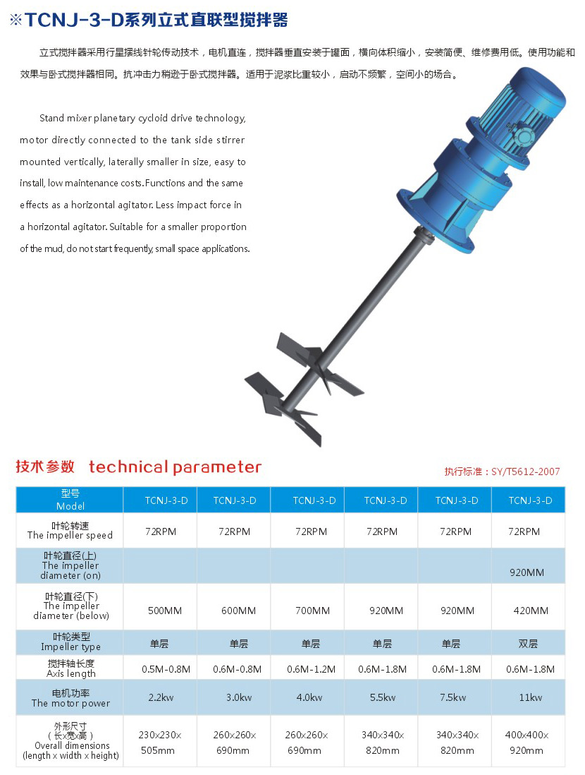 立式泥漿攪拌器采用行星擺線針輪傳動技術(shù),電機直連,攪拌器垂直安裝于罐面,橫向體積縮小,安裝簡便、維修費用低。使用功能和效果與臥式攪拌器相同。抗沖擊力稍大。