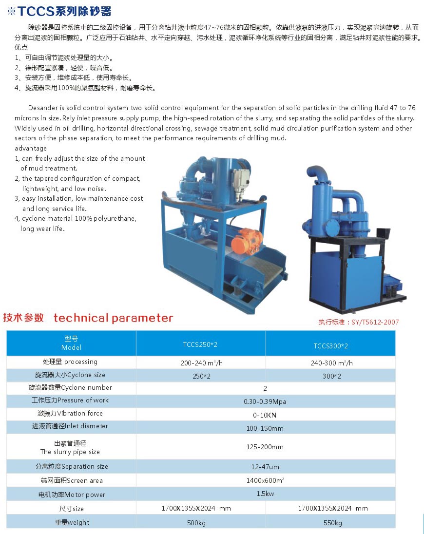 泥漿除砂器是鉆井液凈化的必備設備之一,他能有效過濾掉泥漿中有害固相顆粒,從而保證泥漿的質量。除砂器是固控系統中的二級固控設備,用于分離鉆井液中粒度47~76微米的固相顆粒。廣泛應用于石油鉆井,水平定向穿越污水處理,泥漿循環凈化系統等行業的固相分離。